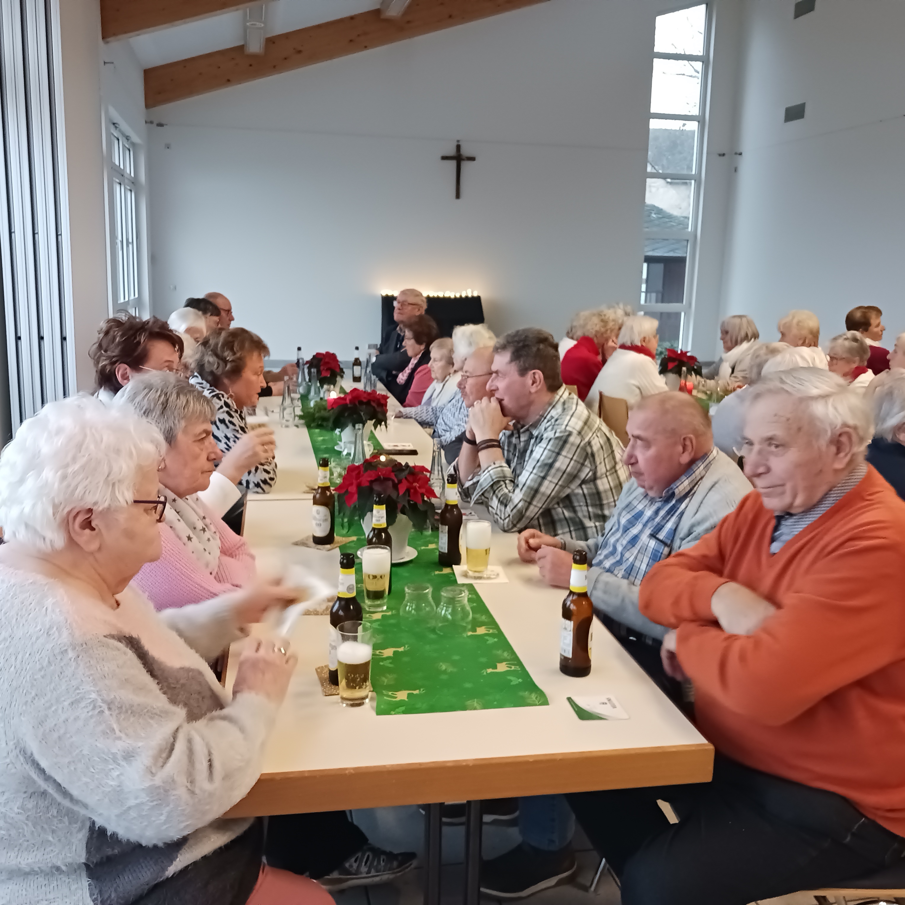 Zu einem Adventnachmittag mit weihnachtlichem Programm hatte die Seniorengruppe am 12. Dezember eingeladen. Ursula Wörsdörfer und Monika Wüst konnten 46 Personen begrüßen. Nach dem Lied „Macht hoch die Tür, die Tor macht weit“ konnte das große Kuchenbüffet gestürmt werden. Nach dem Kaffee klopfte der Nikolaus an die Tür und erfreute alle mit seinem Besuch. Verschiedene Musikdarbietungen, Weihnachtsgeschichten und ein Sketch zum Thema „Weihnachtsessen“ erfreuten das Publikum. Nach dem Abendimbiss wurde noch ein herzliches Dankeschön an alle Helfer ausgesprochen und mit guten Weihnachtswünschen in Form von einem Gedicht konnten alle frohgemut und zufrieden den Heimweg antreten.