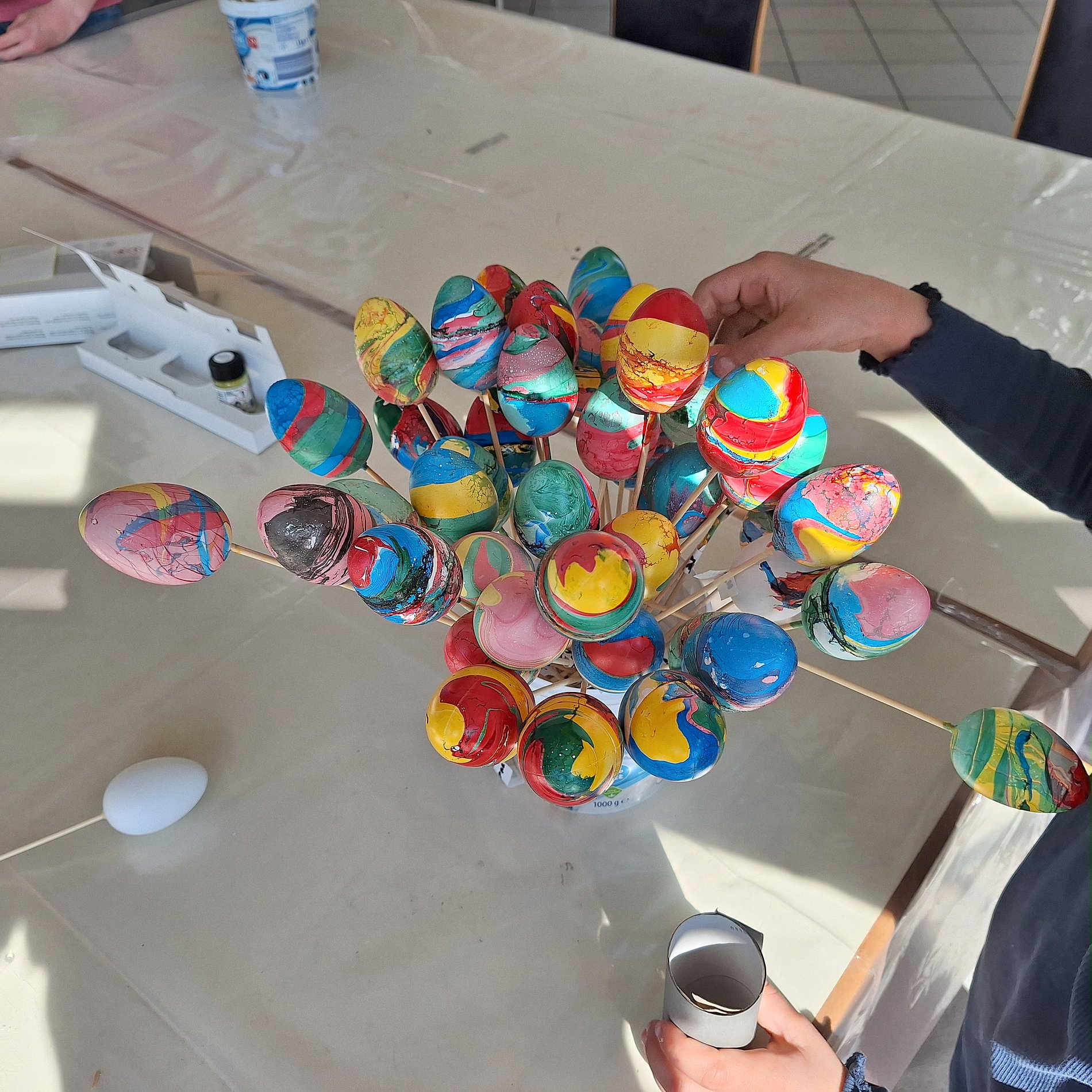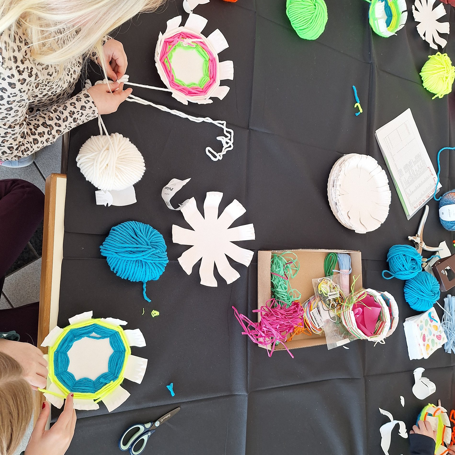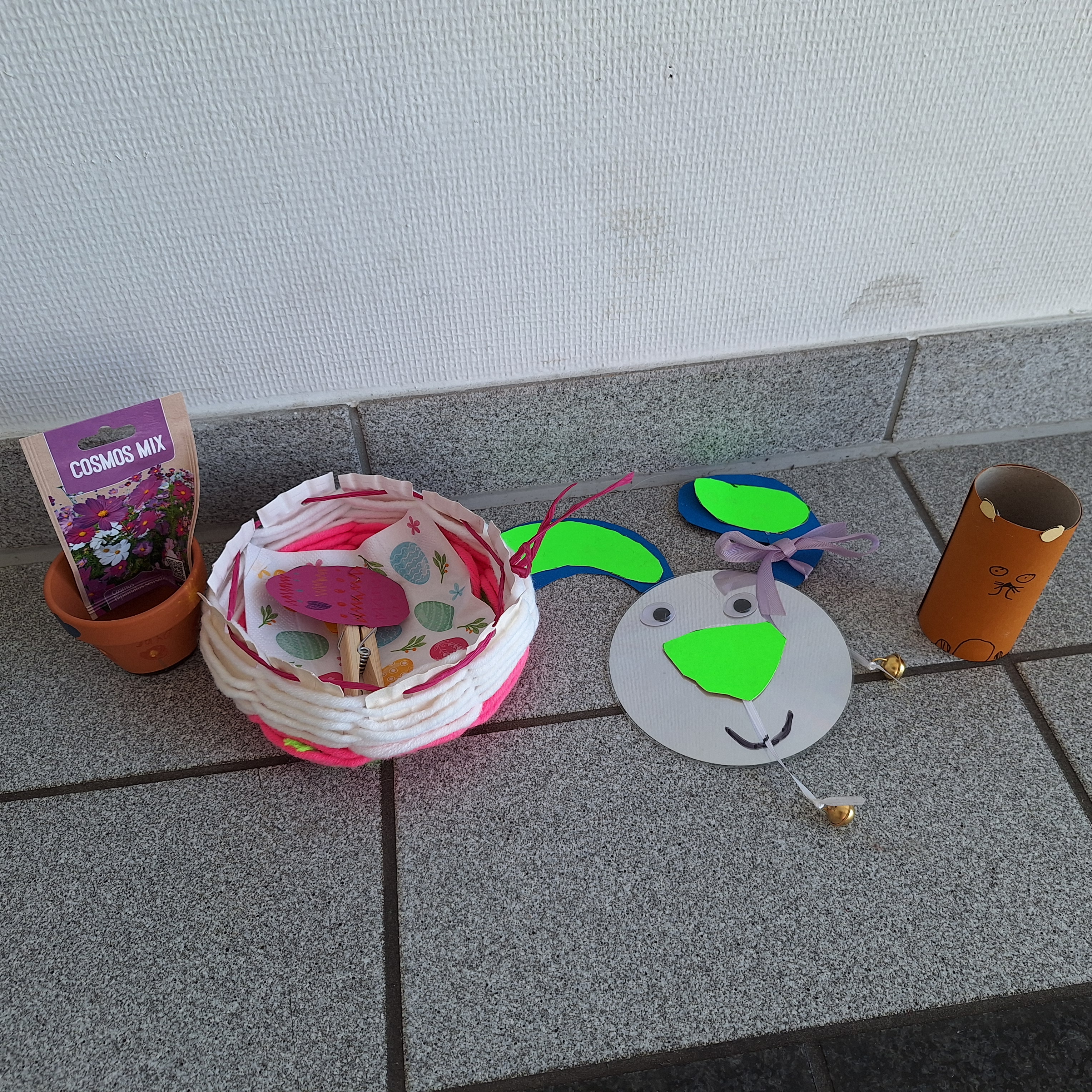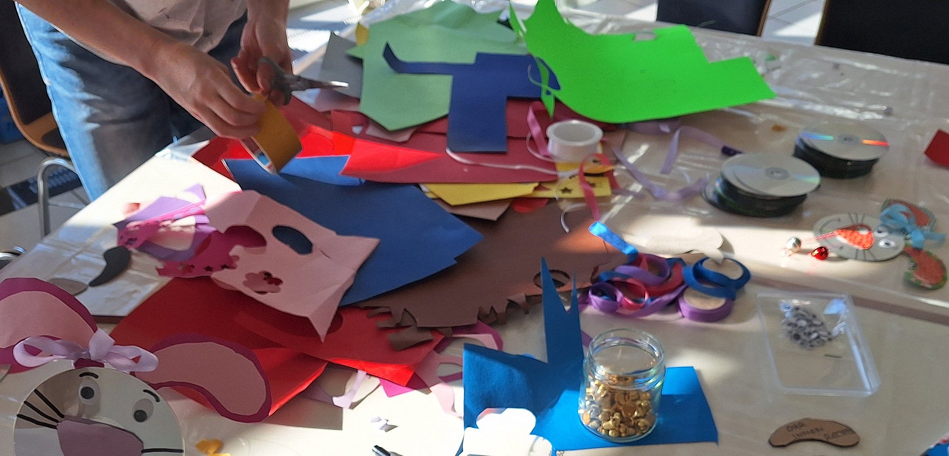 Mit Pinsel, Farben, Wolle, buntem Papier, Schere, Kleber, Wäscheklammern und CDs entstanden