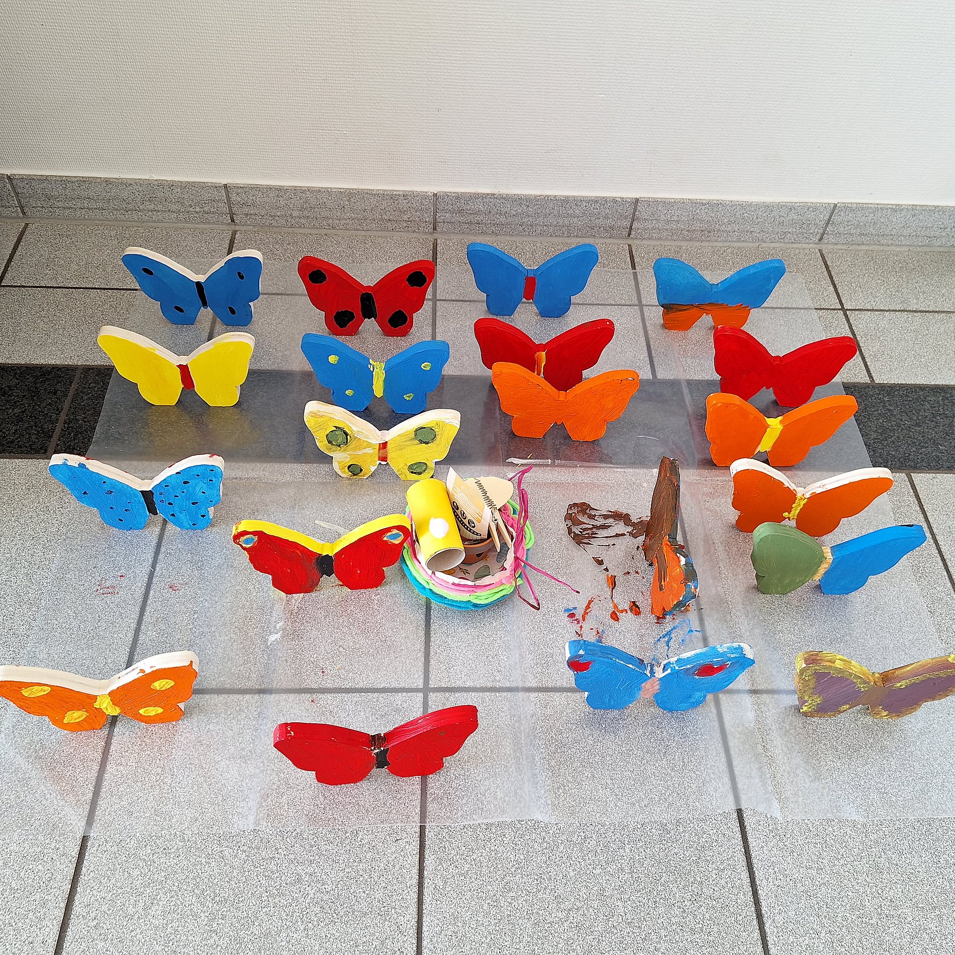 farbenprächtige Schmetterlinge, bunte Osterkörbchen, Osterhasen verschiedenster Arten,