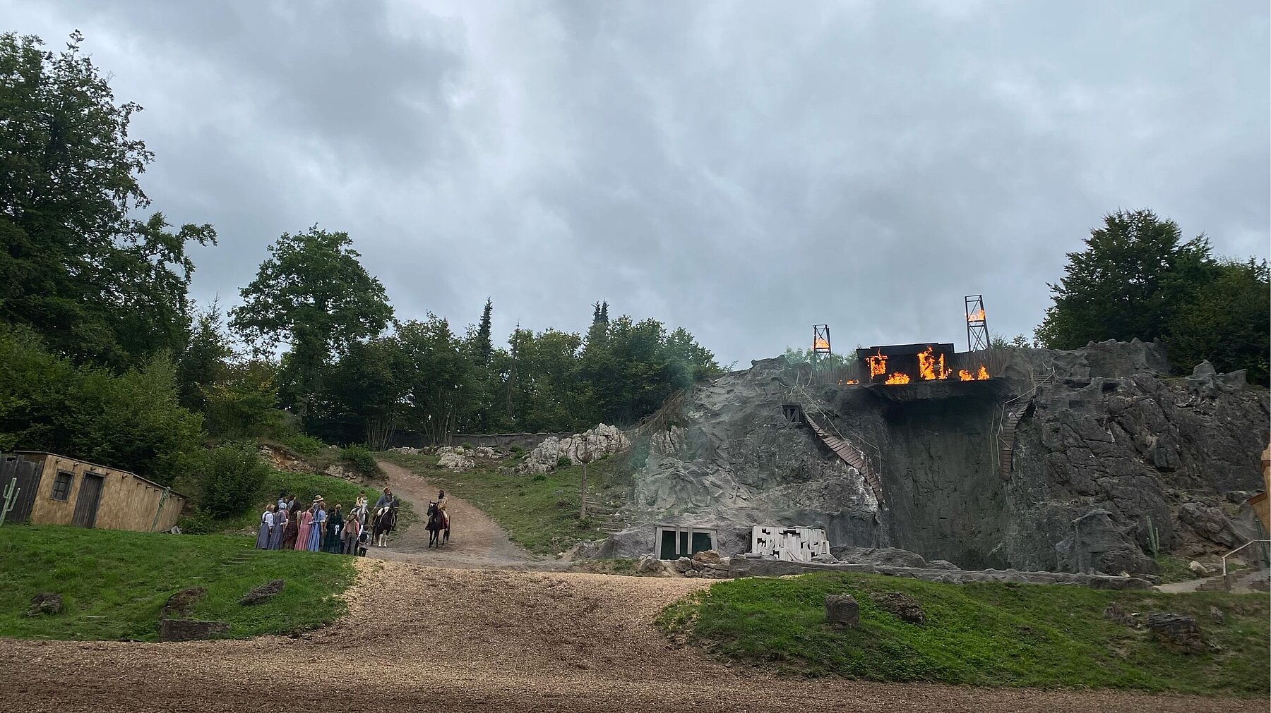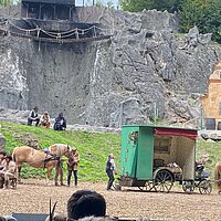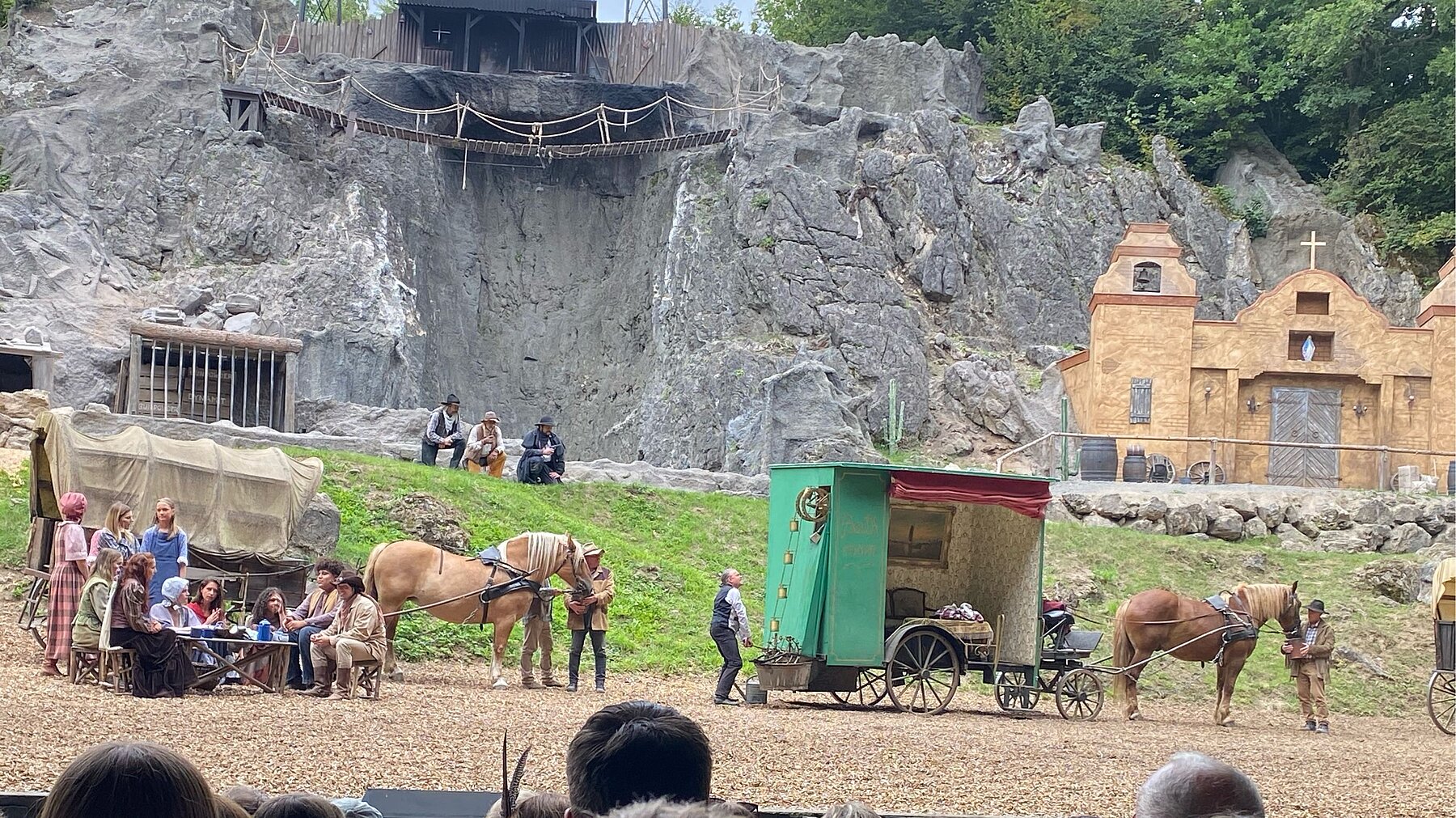 In diesem Jahr machte sich unsere Messdienerschar auf eine Fahrt ins Sauerland nach Elspe. Winnetou und Old Firehand warteten mit ihrem Festspiel "Im Tal des Todes" auf viele Besucher. Bei gutem Wetter erreichten wir per Bus am Sonntag, 17.08.2025 vormittags das Festivalgelände. Zunächst konnten drei tolle Shows (Stunt-, Pferde- und Musikshow) in der Elspe Festival Halle und der Rodeoarena bewundert werden, bevor alle am Nachmittag ihre Plätze auf der Zuschauertribüne vor der Naturbühne einnahmen. Es folgte eine spannende und ebenso lustige Vorstellung mit professionellen Darstellern, toller Musik und einer Mega-Pyrotechnik. Über 40 Pferde hatten ihren Einsatz auf der 100m breiten Naturbühne. Die Zeit verging wie im Fluge und alle traten von Winnetou und Old Firehand inspiriert die Heimreise an. Einige hatten die Gelegenheit genutzt, sich schicke Westernhüte zuzulegen, andere haben sich beim Bullriding amüsiert. Alles in allem war es ein gelungener Ausflug in den Wilden Westen.